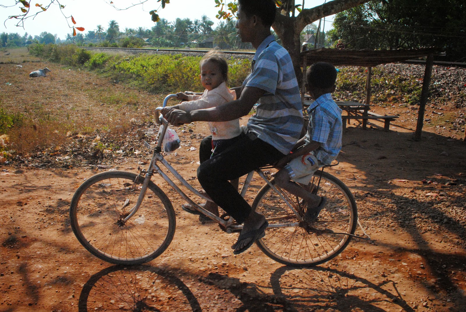 Pelo caminho ainda encontramos uma criança a socorrer uma vaca que estava no charco. A vaca lá se safou num final feliz. Passada muita terra e imenso pó láencontramos o lago secreto. Não sei como é que um lago tão imenso pode ser secreto! Talvez o queiram manter assim para não estragar um lugar edílico no meio do nada. A vegetação de repente transforma-se e a aldeia de casas sobre estacas numa das margens dão-lhe uma aparência de um lugar imaginário. Nunca um chocolate me foi tão proveitoso! Circundamos apenas uma pequena parte do lago e passamos sobre um troço de alcatrão onde as águas do lago banham uma praia de pedras. O Tuk Tuk que seguíamos também para aqui e enquanto conversamos com o casal Francês, o condutor trata de arrefecer o motor da mota com a água do lago, tal o esforço para aqui chegar.