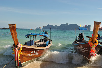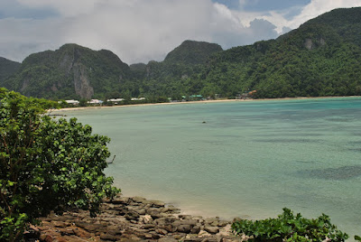 Assim que começamos a aproximar-nos do arquipélago das Phi Phi, começa alguma agitação no barco. Os passageiros dirigem-se para exterior, quais crianças curiosas, quando visitam pela primeira vez um parque de diversões. Os penhascos rochosos e as pequenas baías nas ilhas são motivos mais que suficientes para fotografar. Á chegada, assim que desembarcamos, temos de pagar uma taxa de limpeza na ilha de 20 Baths (0,50€). No cais, vários rapazes levantam placas com o nome dos hotéis, para encontraram os seus hóspedes. No meio de tanta gente lá descobrimos o rapaz do nosso hotel. Pede-nos para esperarmos um pouco pois ainda tem outros hóspedes. Estes acabam por não aparecer e o rapaz foi buscar um atrelado para colocar as nossas mochilas. Seguimos atrás do rapaz, que empurra o atrelado pelas estreitas ruas da ilha. Muito movimento e diversão por todo o lado. Ainda levamos cerca de 15 minutos a chegar ao hotel, numa zona mais afastada do centro, longe da confusão. Mesmo na chegada ao hotel, temos uma subida íngreme e ai damos uma mão ao rapaz para conseguir levar o carrinho até lá acima. Não que ele não conseguisse sozinho, mas acabamos por nos compadecer do seu esforço.