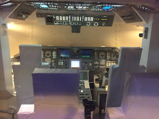 Depois dos simuladores prosseguimos a visita pelo space shuttle. Subimos para avistar o cockpit. É uma imensidão de butões num pequeno espaço onde tinham de coabitar 8 pessoas. É impressionante pensarmos que esta tecnologia foi desenvolvida nos anos 70! Descemos pela parte de traz do space shuttle onde podemos ver de perto os três grandes propulsores que consomem uma média de 2 milhões de litros de combustível por viagem. Um consumo equilibrado para os dias que correm.