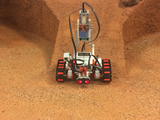 Para conseguirmos descolar o rover desde o ponto de aterragem até à parte inferior, ele tem de descer um pequena rampa durante um tempo predefinido para ficar no local certo para posteriormente podermos virar para mudar de direção. Para conseguirmos colocá-lo no ponto certo são necessários vários testes. Ao fim de várias tentativas conseguimos acertar com o tempo. Agora temos de o virar no ângulo certo para seguir caminho. Mais testes que levam muito tempo porque para além do nosso rover, estão mais 8 na sala que também precisam de fazer testes na superfície de Marte. Ao fim de mais algumas tentativas, conseguimos virar o rover na direção certa. Para já conseguimos descer do ponto de aterragem e virar na direção que pretendemos. A partir daqui a coisa complica-se. Temos de fazer um percurso não linear para contornar a elevação. Vamos utilizar um sensor de ultra-sons para verificar quando estamos próximos da parede e virar de acordo com a trajetória pretendida. Esta parte não vai ser nada fácil. Fazemos os primeiros testes ao sensor, mas entretanto chega a hora de terminarmos por hoje. Deixamos o brick a carregar. Amanhã voltamos ao trabalho.