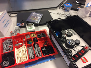 Hoje pela manhã começamos por conhecer o LEGO mindstorms ev3, um kit, para construir robôs. Primeiro familirizamo-nos com o brick, o cérebro do robô que controla todos os componentes do mesmo. É um minicomputador onde são conectados todos os motores e sensores do robô e que depois pode ser programado diretamente através do pequeno ecrã, ou então através de software próprio no computador.