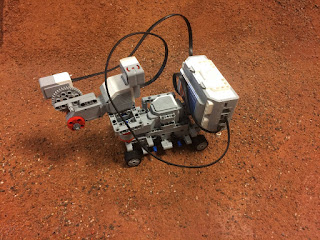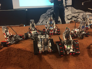 Regressamos ao e-robotics lab para continuar o trabalho no nosso rover. Hoje temos de terminar o percurso pela superfície de Marte para depois passarmos à recolha de dados. Fazemos vários testes para levar o rover a percorrer o percurso desde a aterragem até ao local da recolha de dados. O percurso é grande e com muitas variáveis pelo caminho, por isso decidimos testar por secções. Utilizamos um sensor de ultra-sons para podermos contornar a elevação mas num determinado ponto do trajeto, o sensor deixa de ser funcional. Optamos por programar todo o percurso com temporizador, ou seja temos de definir quanto tempo o rover segue na direção pretendida é depois mudar de direção por mais um determinado tempo e por aí em diante. Não é fácil porque a superfície não é plana e qualquer ligeira alteração afeta todo o percurso. Conseguimos programar todas as secções mas para fazer o percurso de forma contínua seriam necessárias mais algumas horas de teste. Isso não é possível também porque Marte está com o trânsito congestionado a esta hora. São muitos rovers a fazer testes!