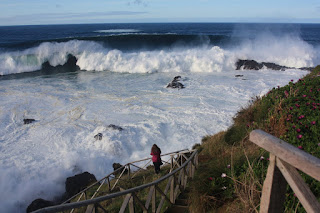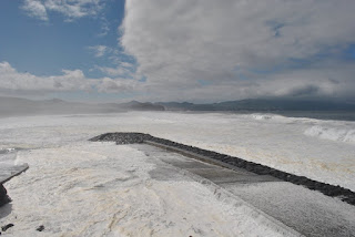 O mar está pouco convidativo, revoltado como referi e imponente. Subimos até ao miradouro do Castelo onde somos borrifados com a água do mar que chega de forma surpreendente com a rebentação das ondas nas rochas. Como se diz aqui na minha terra, “o mar está feito num cão”, e que bicho! Deve ser um Rottweiler. Lá em baixo, as piscinas da Ribeira Grande enchem-se abruptamente à chegada de cada onda. Escusado será dizer que hoje não há banhistas. Mais acima, no miradouro do Palheiro as vagas já não nos atingem, mas o mar continua a meter um grande respeito.