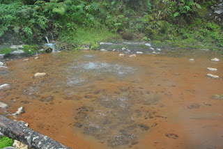 Seguimos para a Caldeira Velha no caminho de quem desce para a Ribeira Grande. Trata-se de um pequeno parque natural com nascentes de água quente. O parque tem duas piscinas naturais, um centro de interpretação da natureza vulcânica e muita diversidade de plantas. Junto à piscina mais pequena tem uma caldeira em permanente ebulição, onde o cheiro a enxofre é tão forte que chega a enjoar. A água é encaminhada da caldeira a ferver por uma pequena levada que desagua na piscina onde a temperatura atinge os 32º C. A água quente e o ambiente natural envolvente levam-nos a um relax total. Ao fim de algum tempo na água começamos a ficar com as pontas dos dedos errogadas, mas quem é que quer sair deste caldo? A muito custo lá convenci as senhoras para irmos conhecer o resto do parque e ainda falta uma piscina.