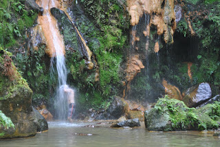 Seguimos para a parte superior do parque da Caldeira Velha pela vegetação sempre imponente. Chegamos à piscina maior que recebe água de uma bonita cascata que se precipita de uma altura de cerca de 5 metros numas pedras meio que desarrumadas numa das extremidades da piscina. Aqui não está tanta gente, ao contrário da anterior o que se percebe facilmente quando colocamos os pés na água. A temperatura está a uns gélidos 24º! Para quem vem da anterior esta água parece estar mesmo fria. Entrei destemido ou não fosse eu dos Algarves, terra inóspita, de frio e águas enregeladas! Á medida que me aproximo da cascata a temperatura vai subindo. Coloco-me completamente debaixo da cascata para receber umas massagens da mãe natureza. Parece que estou no Brasil debaixo de uma cachoeira, mas enquanto lá a água é fria, aqui é quente. Desfrutei até me cansar. Quanto às senhoras, foi preciso muito poder de persuasão para as convencer a entrar. Para a Nikky até foi fácil de entrar. Mas depois de lá estar dentro, habituada à temperatura mais quente da piscina anterior, rapidamente pediu para sair. A Marisa lá a convenci a ir até à cascata lutando contra o frio inicial. A Lucy só se convenceu quando percebeu que se conseguiam umas fotografias bonitas na cascata. Então lá fez o sacrifício em prol da pose para a foto.